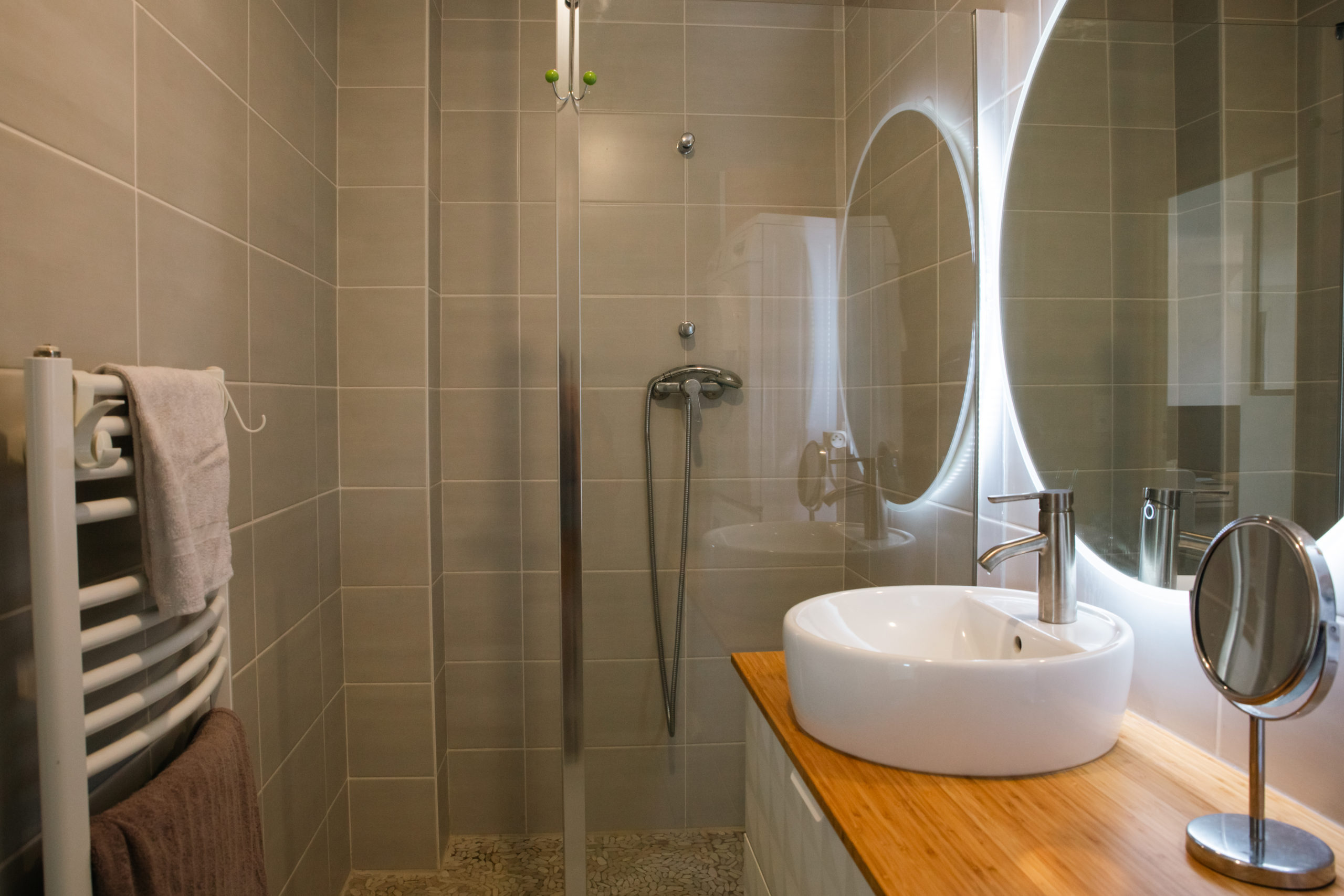 Un bureau avec accès sur le jardin, une salle d’eau avec douche à l’italienne, un WC indépendant, une chambre donnant sur le jardin.